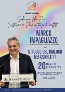 Una serata molto feconda, quella di martedì 20 gennaio 2026 al cinema romano delle Provincie (parrocchia di Sant’Ippolito martire a piazza Bologna): invitato dal Gruppo Cultura Marco Impagliazzo, presidente della Comunità di Sant’Egidio, ha dibattuto con i tanti presenti su religioni, dialogo, pace.